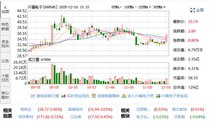 截至12月9日收盘,兴福电子股价报32.85元/股,当日下跌2.41%,总市值约118.3亿元。
