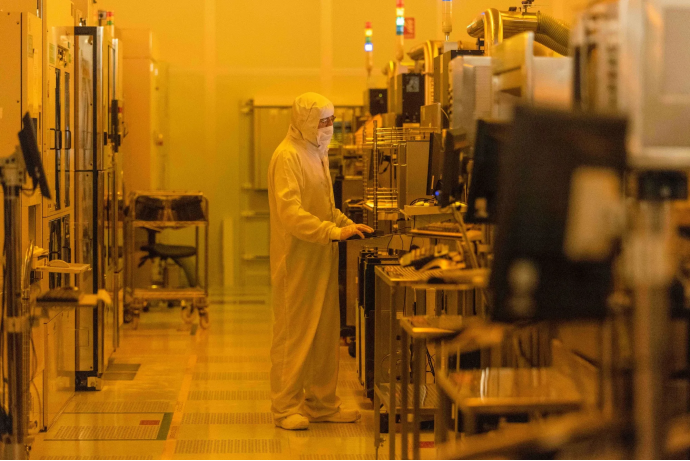 在英国纽波特市的Nexperia工厂,一名工人在洁净室中操作硅半导体晶圆制造设备。