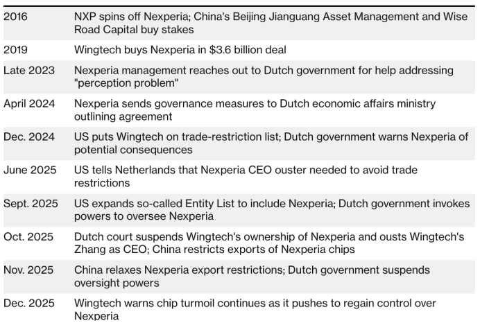 自荷兰法院10月份介入Nexperia的股权纠纷以来,这场僵局已威胁到欧洲乃至全球的汽车生产。一方是公司的核心资产,目前由荷兰法院指定的受托人管理;另一方是一家关键的生产基地,与被剥夺股权的所有者闻泰科技股份有限公司(Wingtech Technology Co.)关系密切——这家电子公司30%的股份由与中国政府关系密切的实体持有。