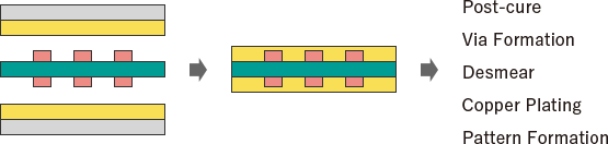 与液体涂料相比可以消除液体树脂涂布过程中由于气泡和印刷不规则造成的良率损失; 与树脂涂层铜箔(RCC)比较,有利于形成精细图案、易于蚀刻、易于激光加工; 与光通孔材料相比,有卓越的设计自由度。当堆叠多个绝缘层时,不仅可以在1-2层之间完成通孔加工,还可以在1-3层之间完成通孔加工。