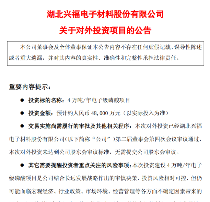 公司董事会审议通过议案,计划投资约4.8亿元,在宜昌新材料产业园建设一座年产能4万吨的电子级磷酸生产项目。该项目资金来源于自有资金及银行贷款,无需提交股东大会审议。目前,项目已完成前期可行性研究,正在推进备案及用地审批,计划于2025年12月15日正式开工,建设周期13个月。