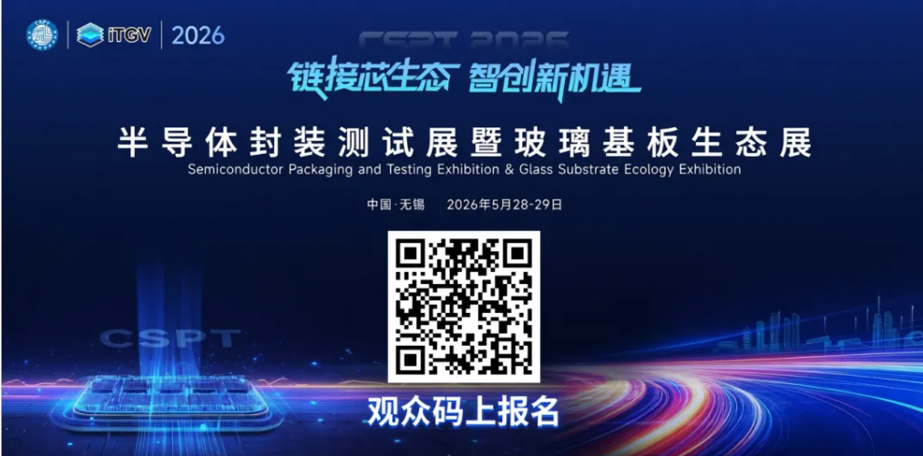CSPT2026半导体封装测试展暨玻璃基板生态展现在正式开启观众报名,长按上面的二维码报名参会吧。观众可免费观展,iTGV2026国际玻璃通孔技术创新与应用论坛为付费会议,CoPoS技术论坛为开放会议。先进封装圈层交流暨中国玻璃线路板产业联盟筹备座谈会为开放会议。