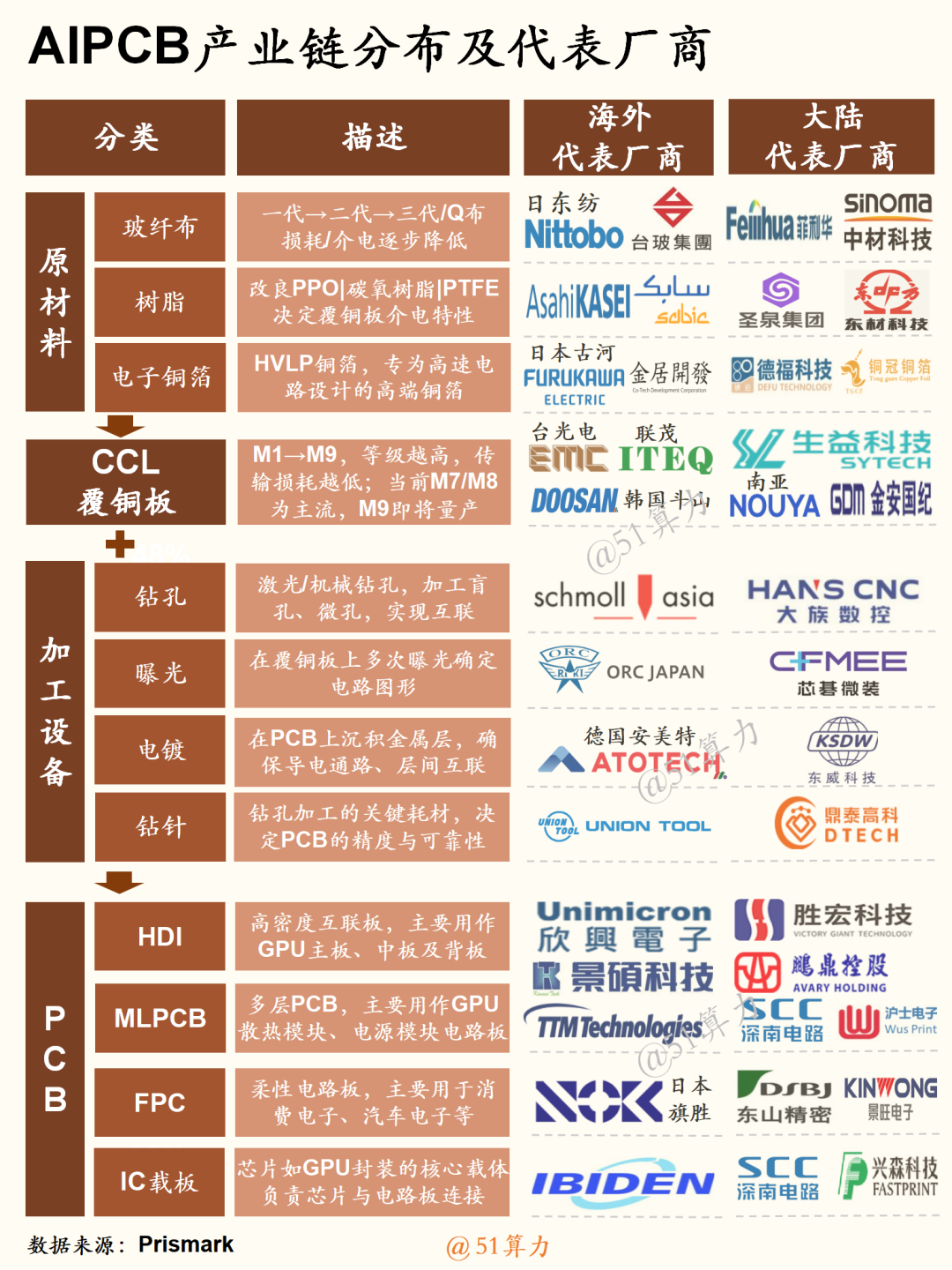 •上游环节:涵盖电子玻纤布(中国巨石、宏和科技)、铜箔(超华、诺德)、树脂(生益、华正)、CCL(生益、南亚),价值占比27%–40%,充分享受涨价红利,盈利确定性最高;
