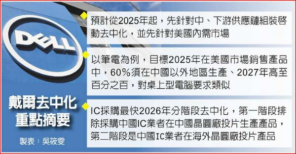 市调机构Gartner数据显示,戴尔去年桌面电脑与笔记本电脑总出货量逼近5,000万台,芯片采购总金额达180亿美元。即使在全球解封与经济不景气下,接下来两三年戴尔的PC全年出货量也有约4,700万台,各类芯片一年采购金额估达160亿美元以上,芯片采购去中化对芯片供应商的供应链转移影响有待观察。对于戴尔在终端与周边(如键盘、电源供应器、风扇等)制造供应链上的去中化,则先从美国内需市场开始。据了解,戴尔近期密集与中、下游供应链协商,以笔记本电脑为例,戴尔要求2025年开始,戴尔供应美国市场产品,60%必须由中国大陆以外厂区生产,2027年美国市场产品在中国以外地点组装比例,必须来到百分之百,而戴尔对桌面电脑也有类似的要求。业界分析,美国市场对戴尔笔记本电脑出货量贡献度超过40%,以此推算,笔电2025年在中国大陆以外厂区组装量就有1,800万~1,920万台,2027年百分之百在中国大陆以外组装时,组装量达3,000~3,200万台,对推动PC供应链从中国大陆向海外转移的影响不容小觑。
